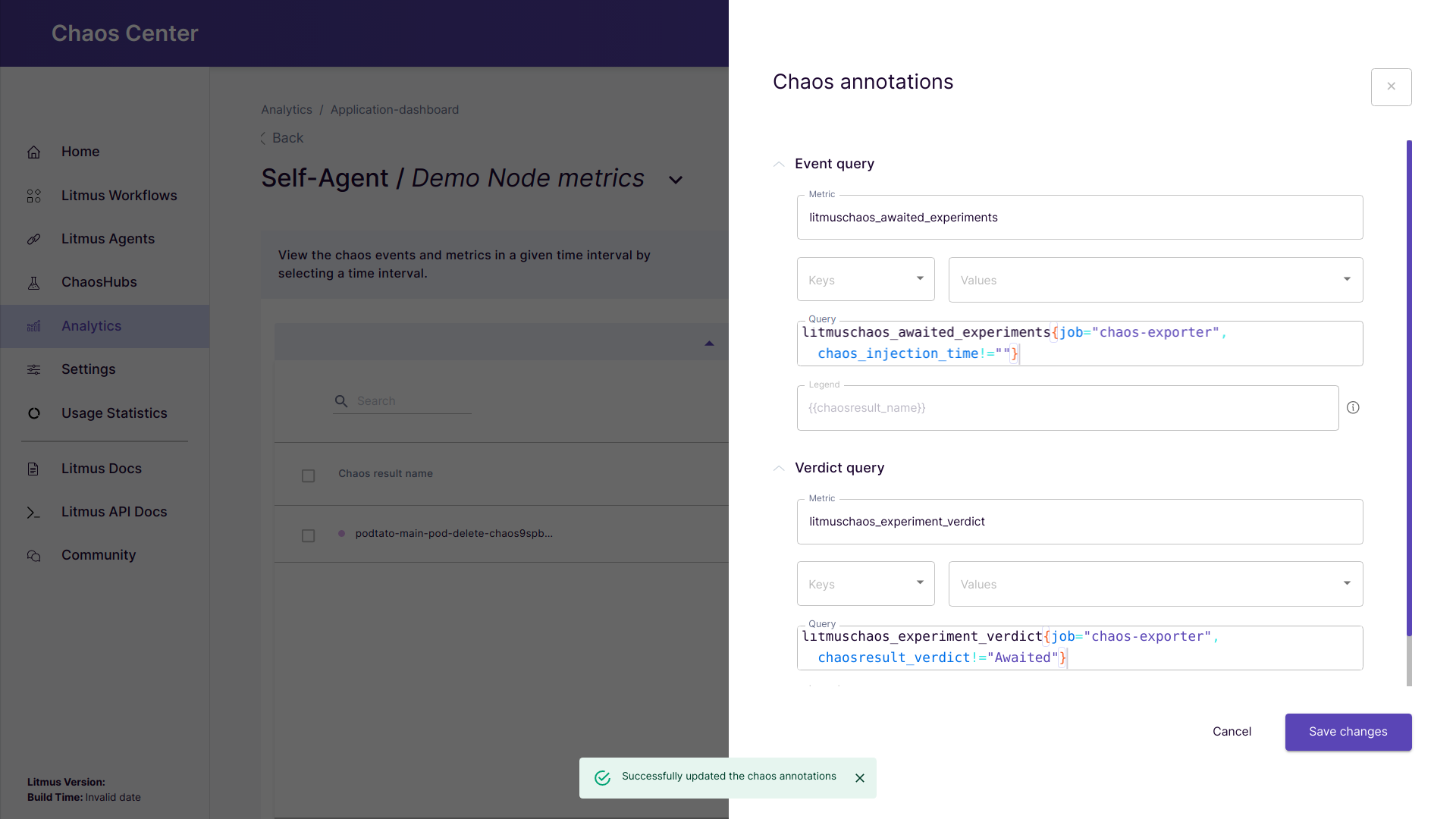 • Verdict query: Query related to the verdict/results of the chaos injection. You may edit them as per your requirement.