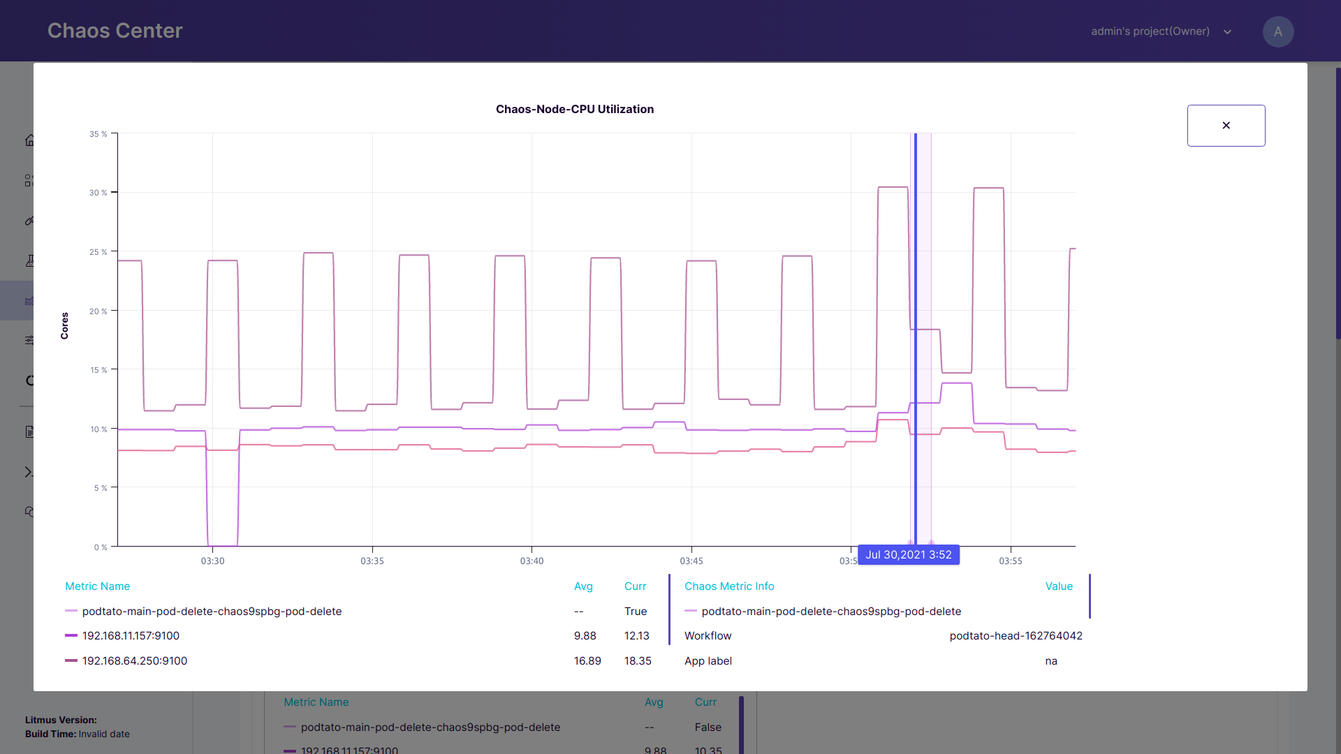• View chaos metric info: For the particular graph, if you want to view the chaos scenario -related information in the table then you may first expand the graph and hover over the specific chaos event to view all its chaos scenario -related information.